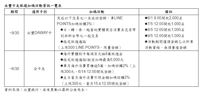 永豐銀行表示,迎接暑假旅遊旺季到來,永豐DAWAY卡推出卡友專屬旅人回饋,9月30日前刷永豐DAWAY卡,除原權益新戶最高LINE POINTS回饋3%無上限,另加碼於日本、韓國、泰國及越南當地實體商店或指定旅遊通路消費,且交易幣別非新台幣的一般交易,或至指定旅行社、旅遊平台、免稅店或航空公司等通路完成交易且成功登錄,再享LINE POINTS加碼回饋3%(限量5000名)。