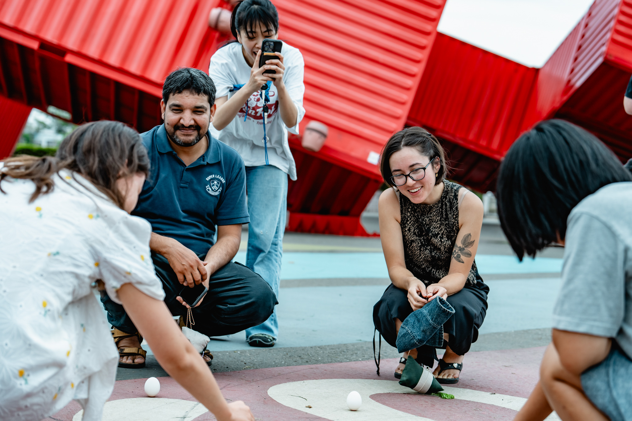 ↑圖說:首次挑戰立蛋的藝術家及國際學生,不只比拼誰的蛋撐最久,更直喊:「立蛋好好玩!」(圖片來源:高雄市文化局提供)