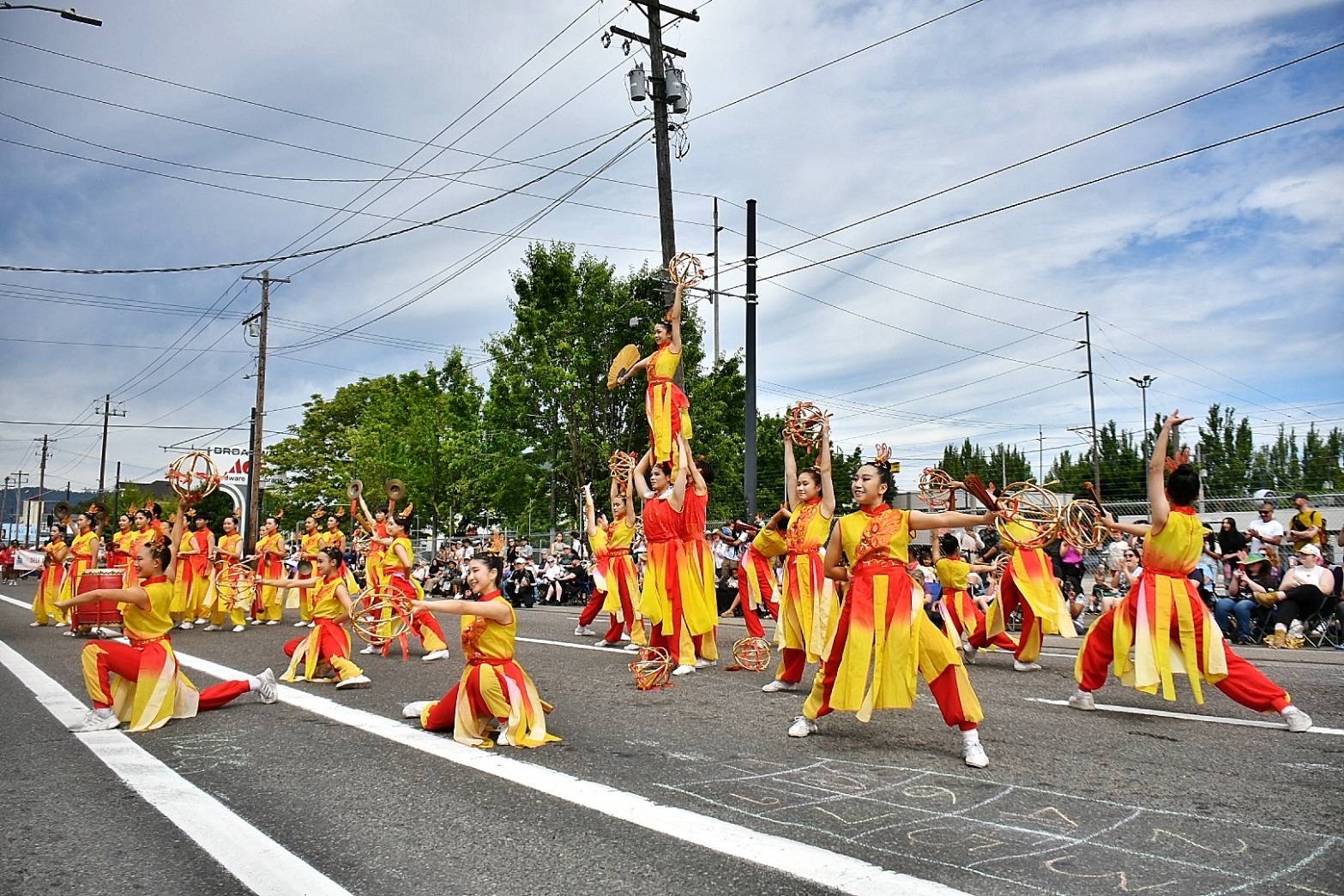 作為波高兩市城市外交尖兵的樹德家商,今年第30度出訪波特蘭,由董事長朱元祥率領36位學生,於玫瑰節遊行帶來「金球飛舞」精彩演出,學生身著亮眼的紅黃色舞衣,手持折扇與金球,配合明快的鑼、鼓、鈸及嗩吶曲調,在行進間穿插下腰、翻跟斗、疊羅漢等高難度演出動作,博得圍觀群眾頻頻喝采、比讚,2小時的遊行路程中掌聲不斷。陳盈秀代表高雄市長陳其邁向多年來積極參與城市外交的高雄樹德家商師生致意,感謝樹德師生長年的付出,為兩市文化慶典交流注入活力。