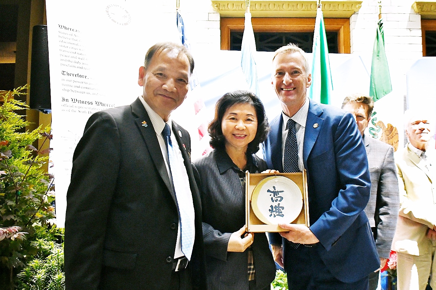 ↑圖說:陳盈秀(中)於姊妹市接待會致贈高雄翻轉文字窯燒瓷盤予波特蘭市泰德惠勒市長(右)(圖片來源:高市行國處提供)