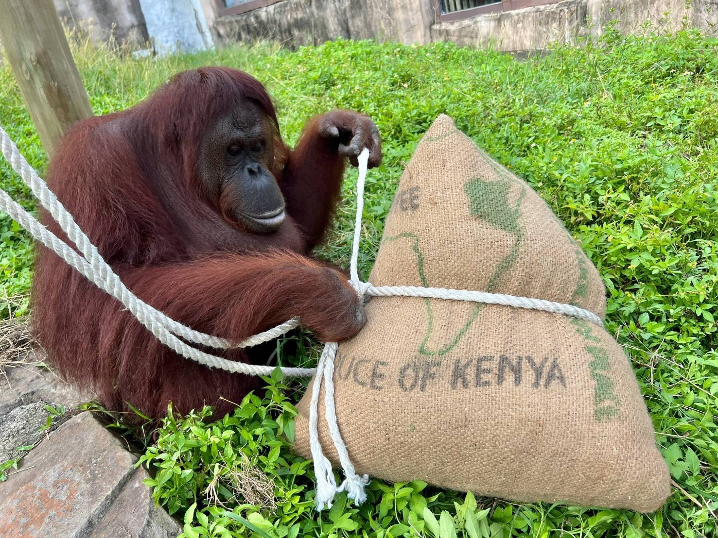↑圖說:紅毛猩猩認真拆解粽子形狀的大香包。(圖片來源:高雄市觀光局提供)
