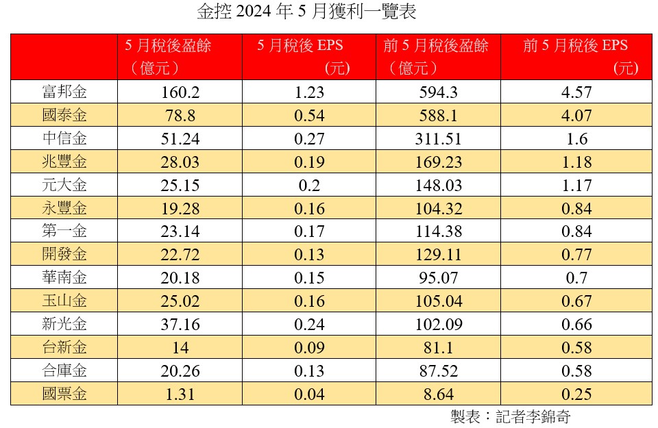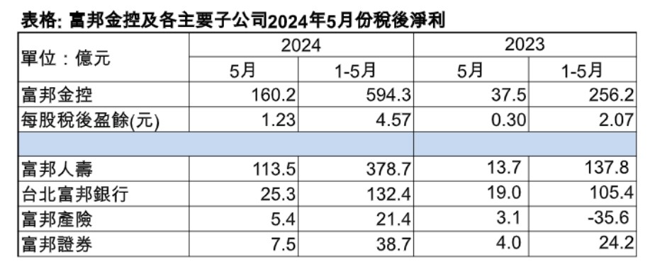 金控5月獲利全數出爐!富邦金控5月自結合併稅後淨利160.2億元,單月獲利創歷年同期新高,EPS高達1.23元;累計今年前5月合併稅後淨利594.3億元,EPS 4.57元,重登金控獲利王寶座。