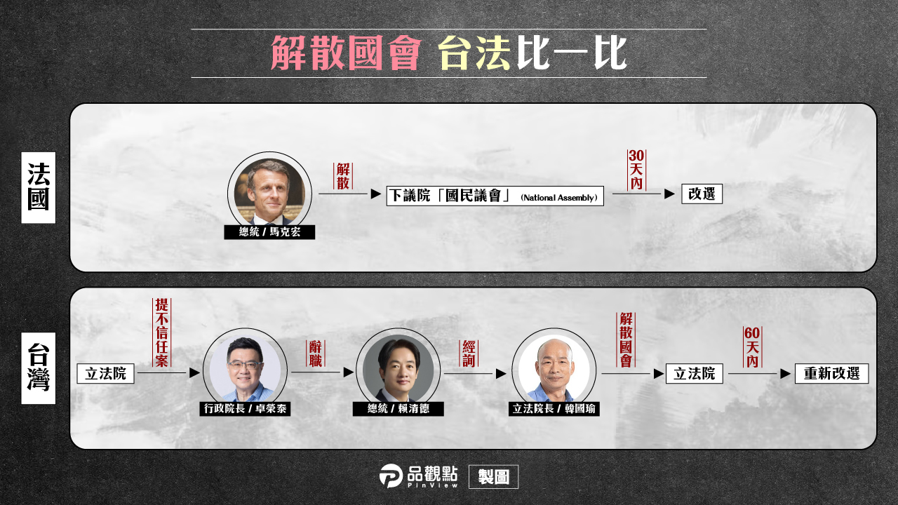 《品觀點》也整理法國、台灣解散國會流程簡易圖,讓民眾秒懂相關流程。