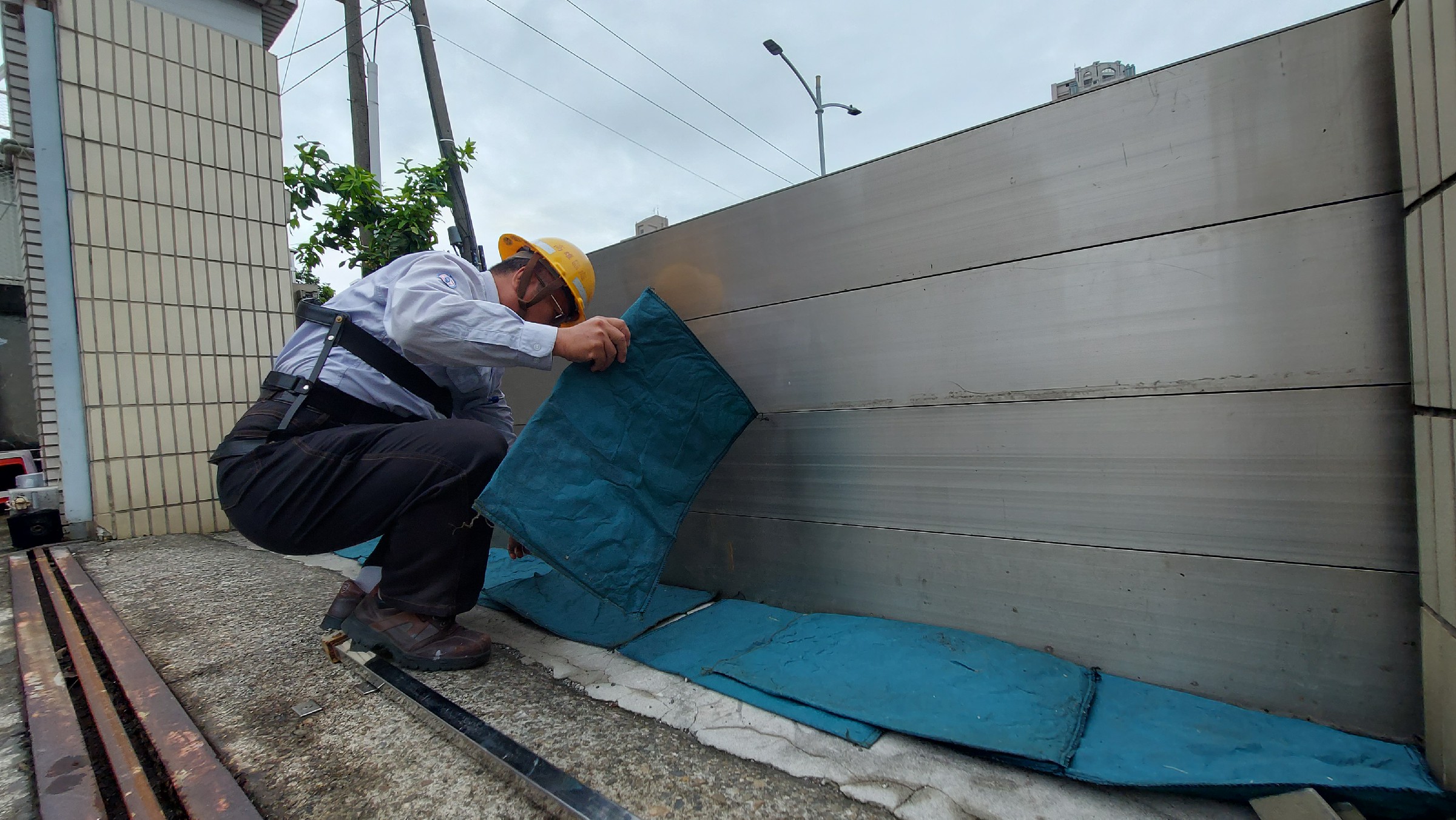 ↑圖說:台電高雄區處民族變電所為防止豪雨造成變電所淹水,特別準備科技沙包於豪大雨期間交疊擺放在變電所門口,防止淹水。科技沙包遇水膨脹,曬太陽則恢復原樣,具環保性、且可重複使用。(圖片來源:台電高雄區處提供)