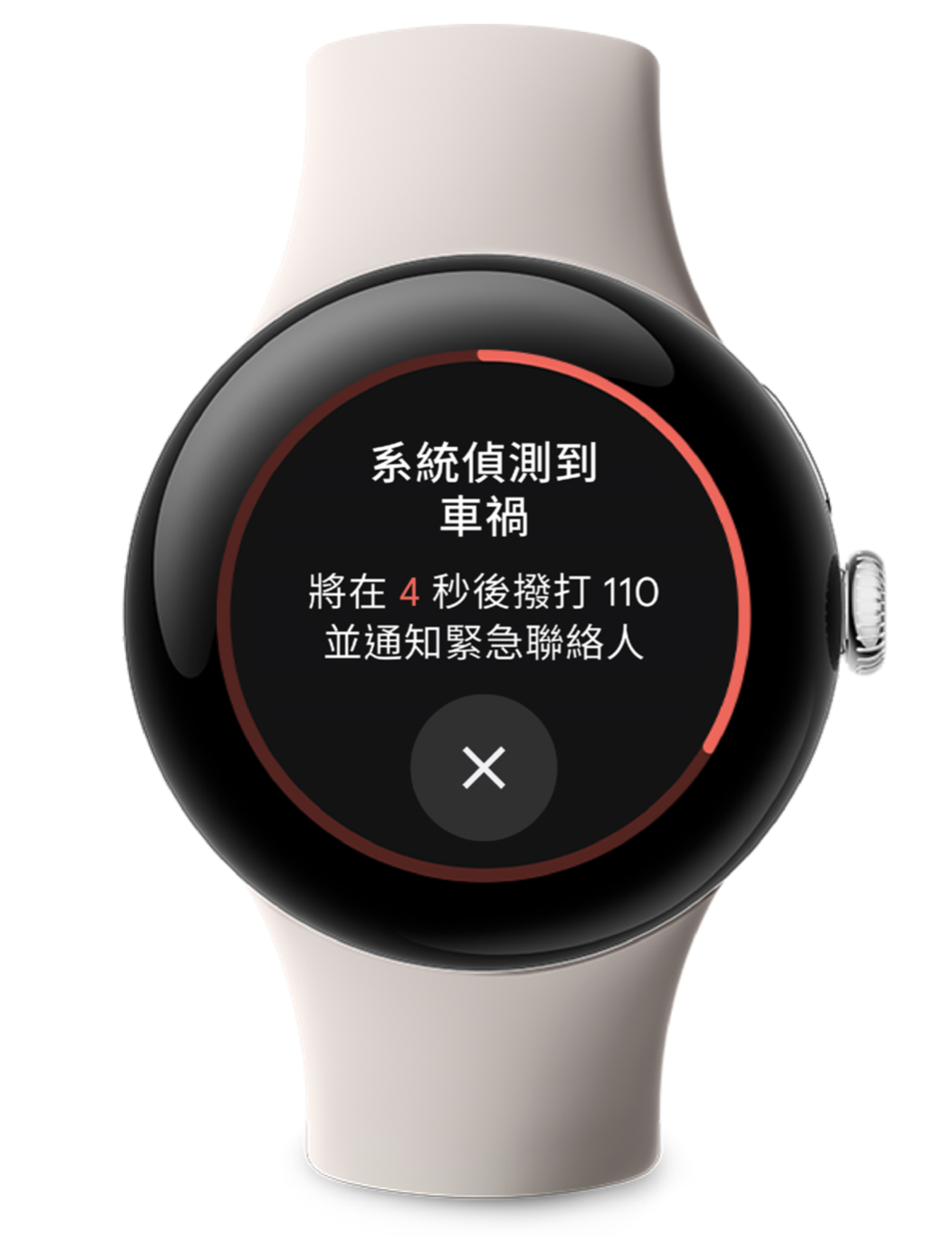 在 Pixel 手機上推出的「車禍偵測」功能將在 Pixel Watch 2全新推出,即使是手機不在身邊時,也能為使用者帶來幫助。碰到嚴重車禍時,Pixel Watch 2 會檢查用戶的狀況,如果需要協助或未回覆,手錶就會自動撥打緊急救援服務電話。(如下圖,Google台灣提供)