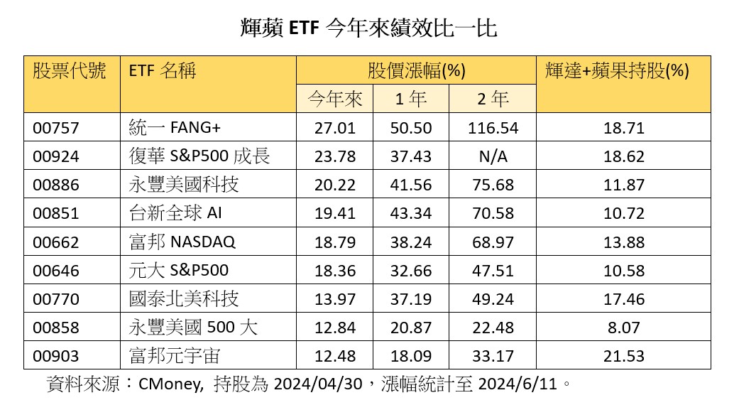 根據CMoney四月底數據,台灣掛牌的ETF中,同時持有輝達及蘋果的ETF共有九檔,持股比例在21.53%~8.07%。檢視這些輝蘋ETF今年來的績效表現,漲幅至少12.4%起跳,近1年漲幅至少18%。