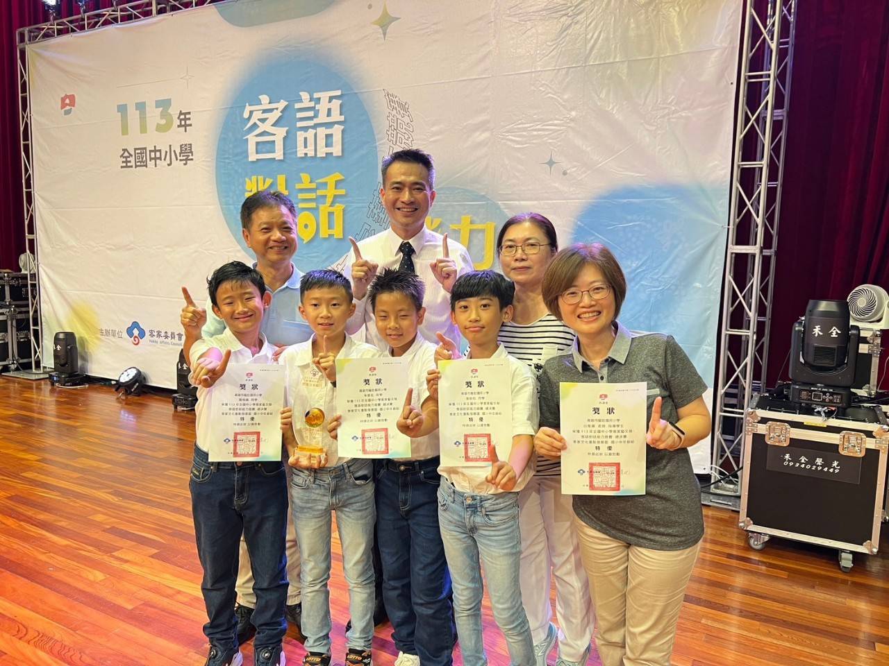 ↑圖說:龍肚國小-「傳奇四人組」隊獲國小中年級組特優與指導師長們合影(圖片來源:高雄市客家事務委員會提供)