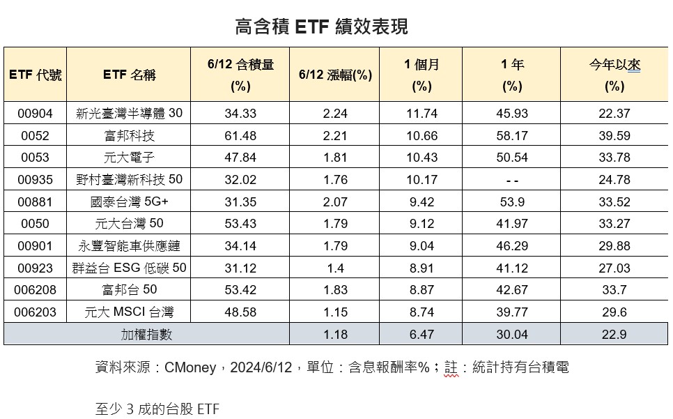 回頭來看台股ETF,今天有32檔收盤價創新高,其中,持有台積電的「含積ETF」佔24檔,其中,新光臺灣半導體30 ETF(00904),近1個月含息報酬11.74%,居科技型ETF之冠,其他「高含積量」的包括富邦科技ETF(0052)、元大電子(0053)與野村臺灣新科技50 (00935)漲幅也超過10%;如果看市值型ETF,緊貼台股的元大台灣50 (0050)、富邦台50(006208)兩檔,也分別上漲9.12%、8.87%。