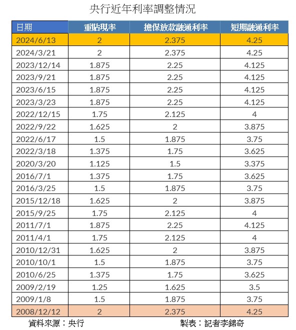 本行重貼現率、擔保放款融通利率及短期融通利率,分別維持年息2%、2.375%及4.25%。