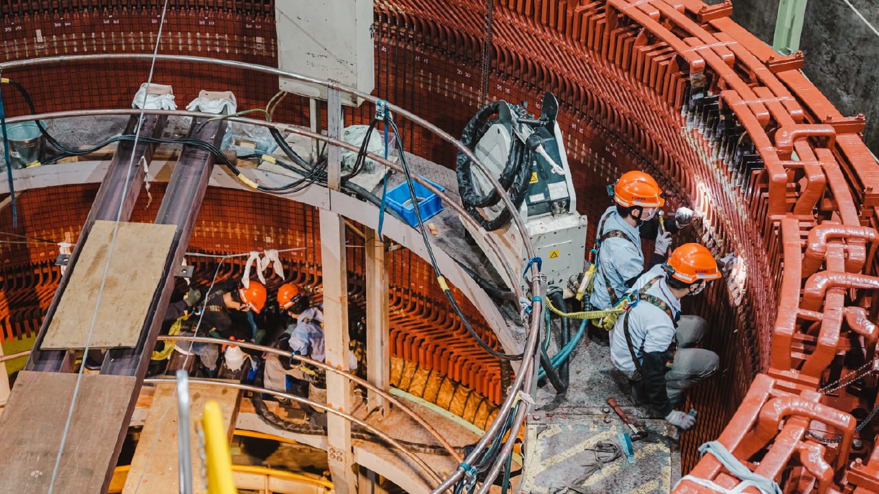 台電指出,封水銅條位於抽蓄機組內,在控制水流進出的水輪機導翼上、下方,平時搭配抽放水發電需求,用於封水及阻隔空氣,因經年累月受水流沖刷產生水蝕刻痕,約8至10年需定期汰換,確保機組穩定運轉。(如上圖為大觀電廠大修機組內部畫面,台電提供)。