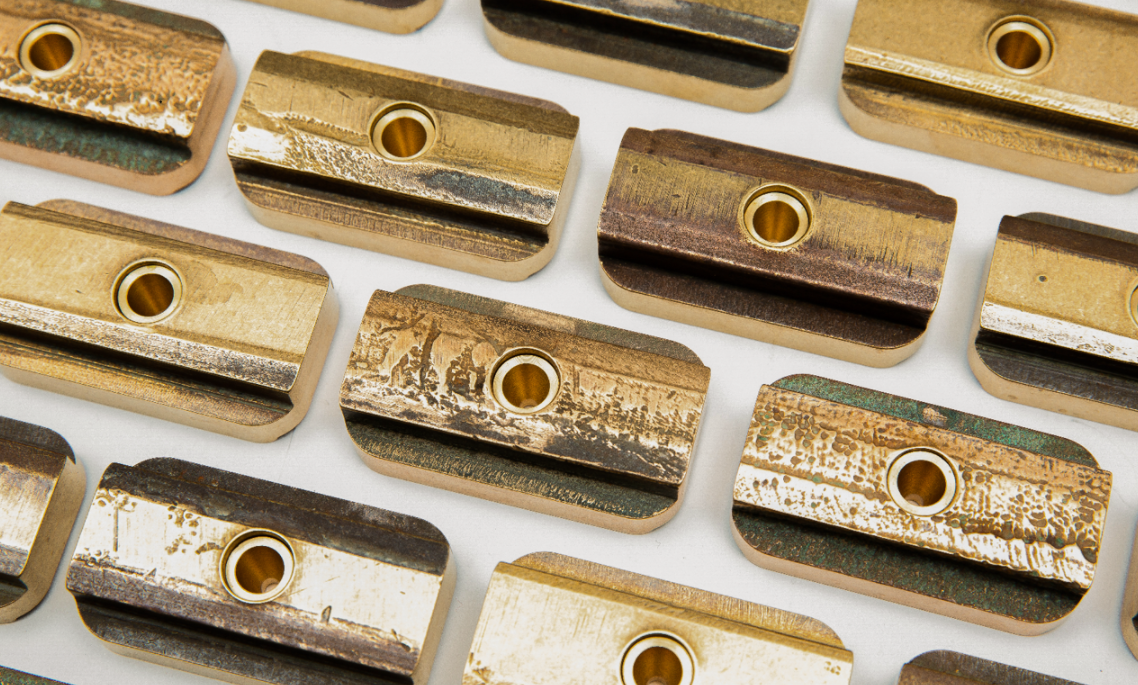 而此次文創再製計畫使用的循環材料,即來自兩座電廠抽蓄機組水輪機內獨有構件,一部機共有40支重逾2公斤、長約50公分的退役回收銅材「封水銅條」(如上圖,台電提供)。