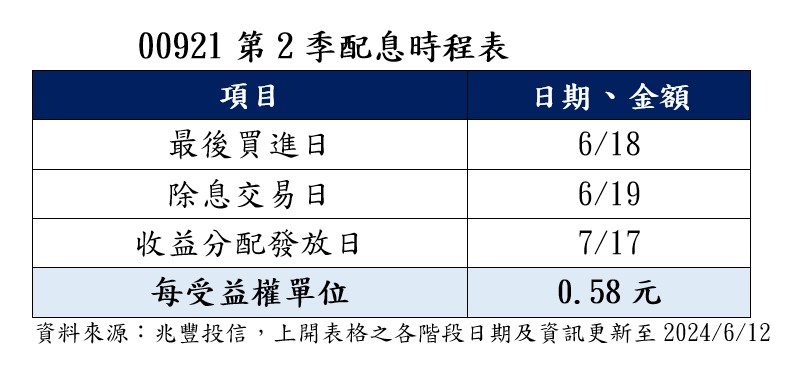 兆豐台灣產業龍頭存股等權重ETF(00921,簡稱:兆豐龍頭等權重),除息倒數計時!這次的除息交易日為19日,領息的最後買進機會,只剩明(18)天,收益分配發放日為7月17日,每受益權單位配發0.58元,跟初估一樣。以上週五的收盤價19.63元計算,單次殖利率0.295%,年化殖利率高達11.8%。