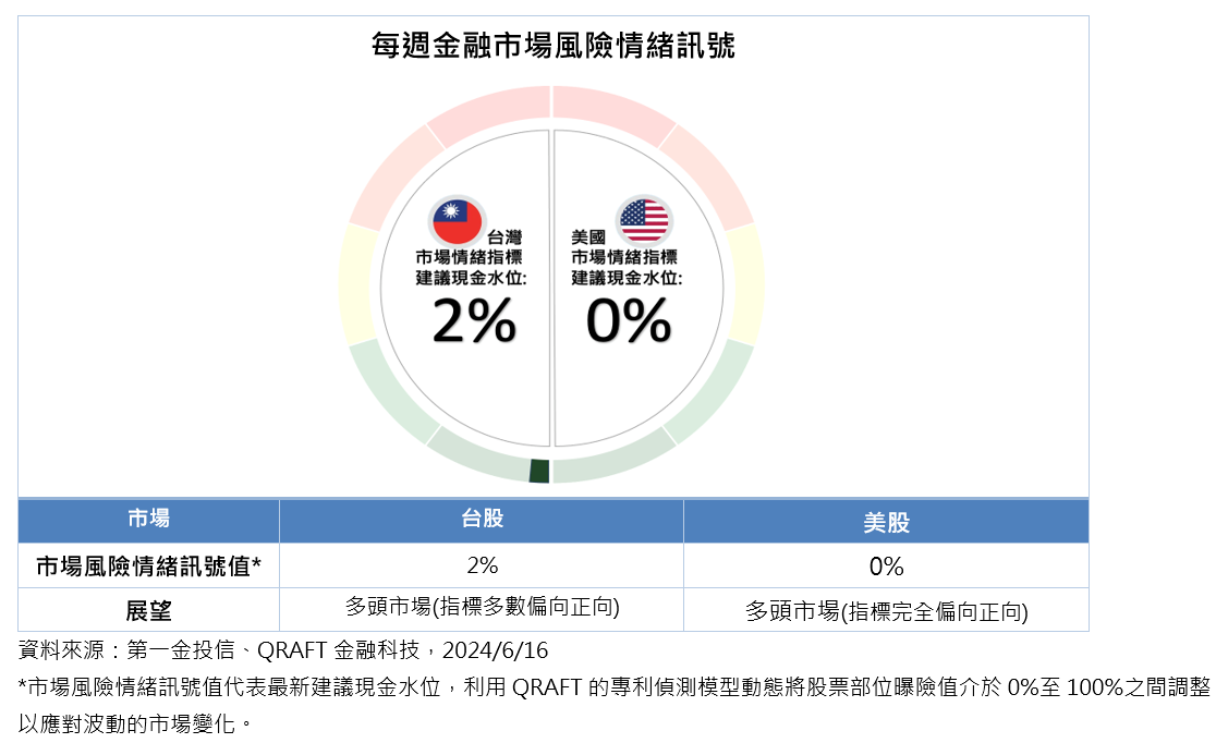 第一金投信與韓國QRAFT金融科技公司(QRAFT Technologies),自3月啟動AI驅動金融投資技術開發合作後,本週正式聯名對外發布每週金融風險情緒訊號,建議美股現金水位為0%,代表多頭市場看法,各項指標完全偏向正向;台股現金水位為2%,亦為多頭市場看法,多數指標偏向正向。