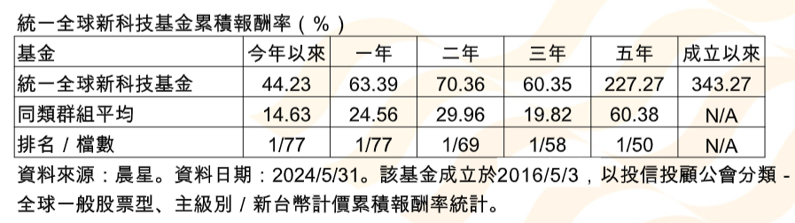 統一全球新科技基金為例,持股策略因與AI有高度關聯性,今年前5月已大漲44.23%,為同類基金績效之冠,且短中長期的累積績效也都第一名,遙遙領先同類群組平均。