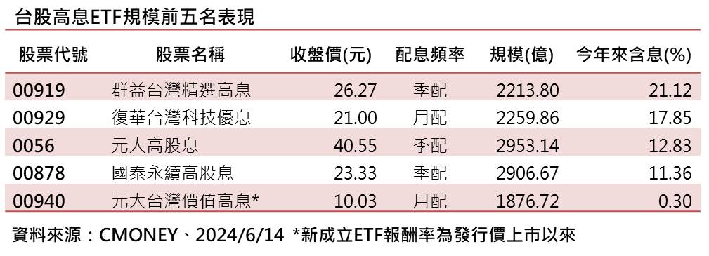 進一步觀察5檔規模超過千億的高息ETF,包括群益台灣精選高息ETF(00919)、復華台灣科技優息(00929)、元大高股息(0056)、國泰永續高股息(00878)、元大台灣價值高息(00940),截至上週五為止,今年來含息報酬率以00919的21.12%表現最佳,其次是00929的17.85%。