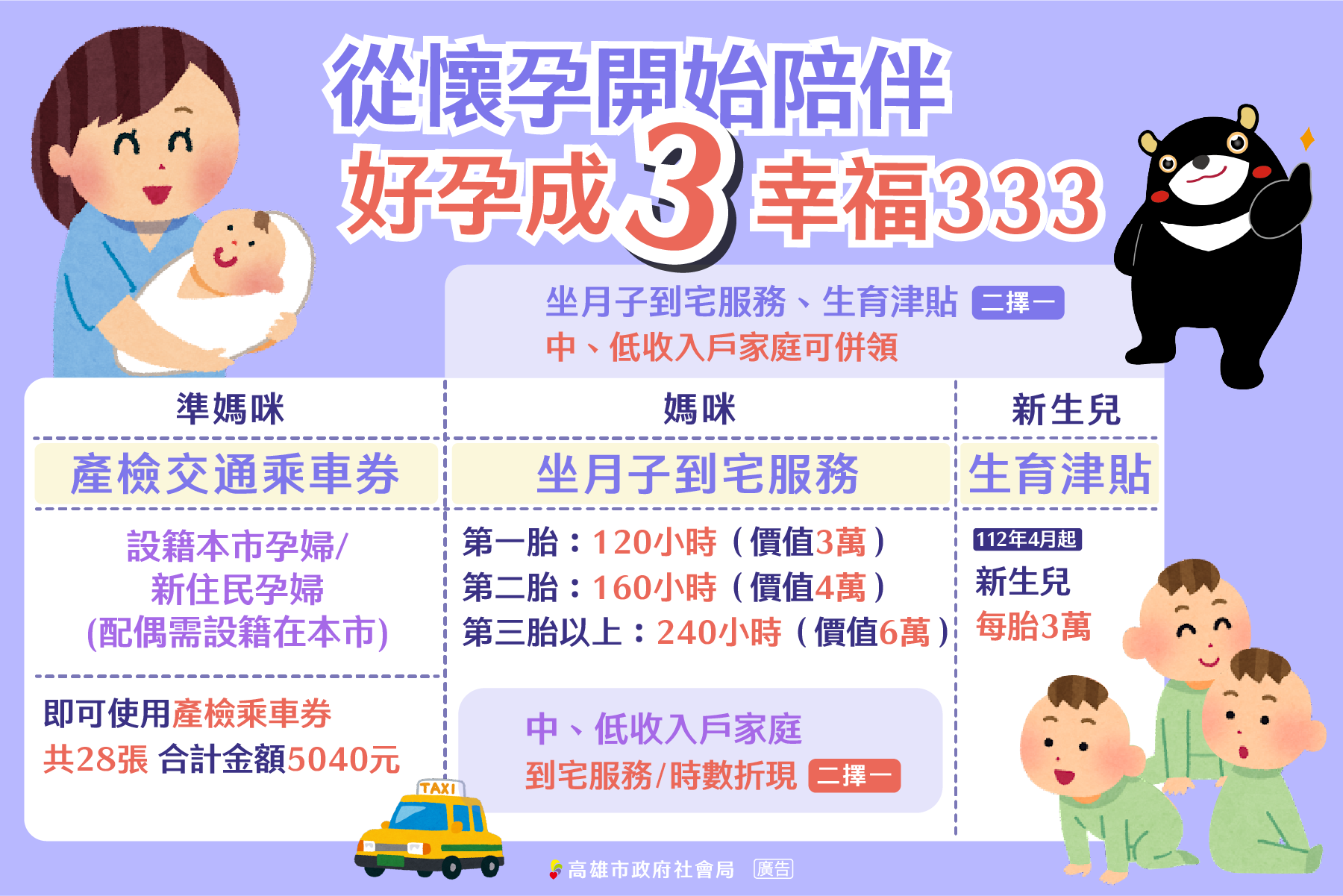 高雄市政府為支持市民生育並減輕育兒負擔,推出好孕成「3」幸福「333」方案,為每胎新生兒提供3萬元的生育津貼,也可依胎次選擇換取價值3萬元(120小時)、4萬元(160小時)或6萬元(240小時)的『坐月子到宅服務』,經濟弱勢產婦可同時併領生育津貼及坐月子到宅服務補助,並全面補助設籍孕婦產檢交通補助,且延長使用至新生兒出生後6個月。在托育補助方面,除了中央提供的補助外,高市還加碼補助,實質減輕家長育兒負擔,實踐政府與家庭一起承擔照顧責任的承諾。