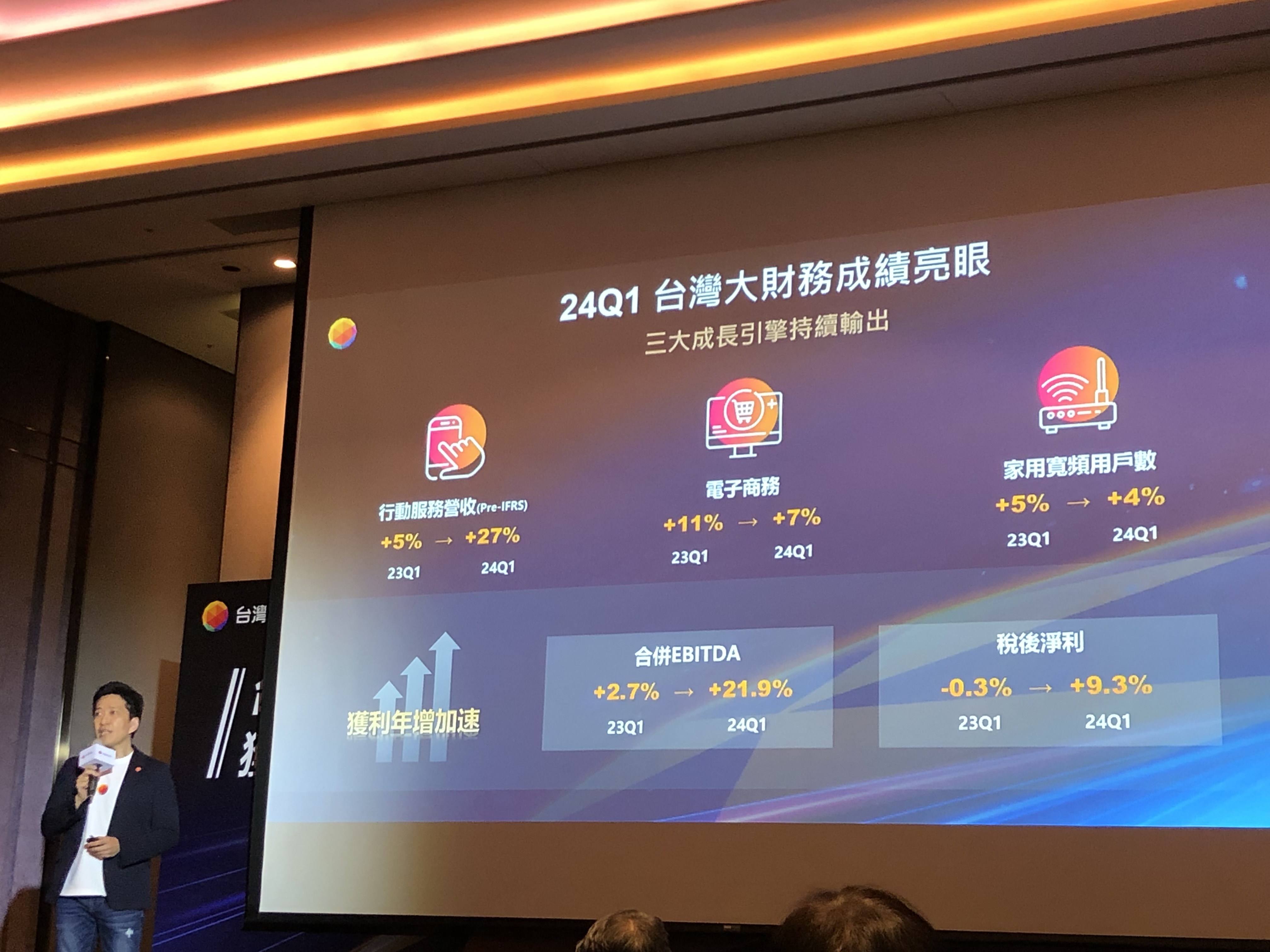 台灣大指出,第一季合併EBITDA年增22%,總營收年增52.6億,合併營業利益年增9%,創下2018年第二季以來新高;稅後淨利年成長9.3%,成長金額居業界第一;電信本業部分,4G升級續約5G的用戶,平均月租費增加46%;第一季電信服務營收年增25%,5大財務指標都居業界第一。