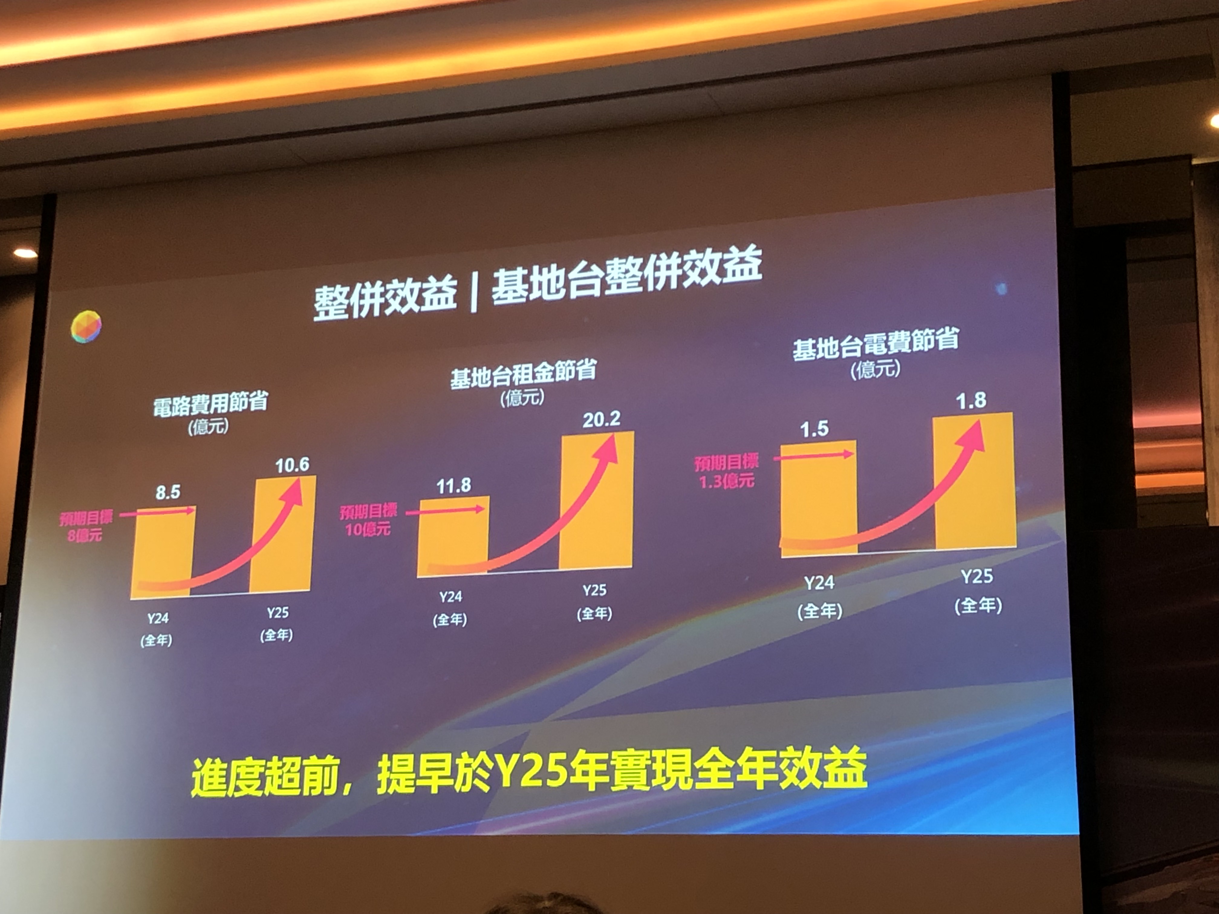 整併基地台也帶來其他效益,包括電路費用今年預估節省8.5億元,明年可節省10.6億元;基地台租金預估今年節省11.8億元,高於預期目標的10億元,且明年預估可省20.2億元;電費節省1.5億元,預估明年可節省1.8億元。(如下圖,記者李錦奇攝影)