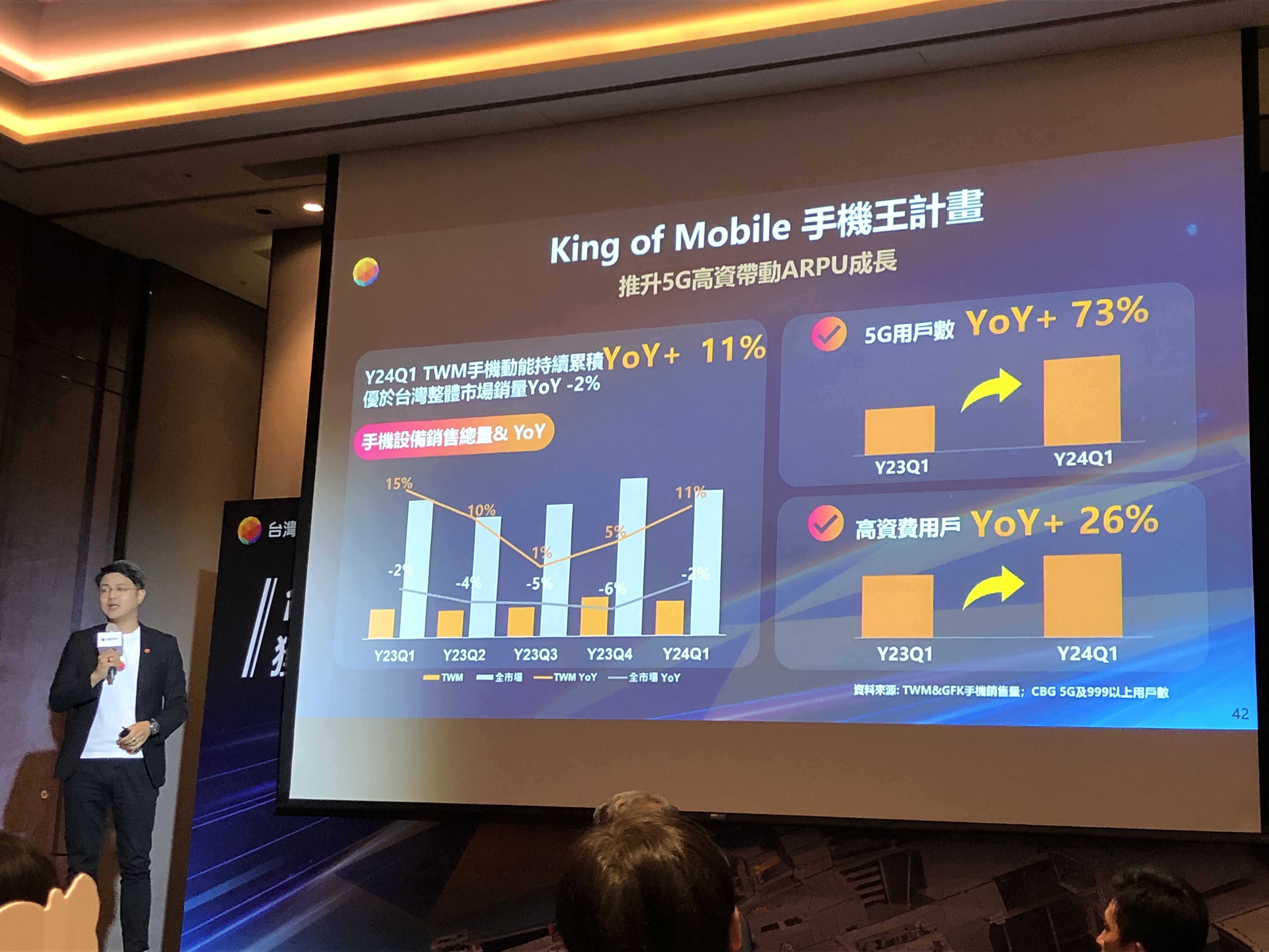 林東閔說(如上圖,記者李錦奇攝影),「King of Mobile計畫」,緊密與各原廠合作,推出多元獨家機款,第一季終端銷售總量逆勢增長11%、5G用戶數年成長超過7成,月租999元以上高資費用戶,年成長超過2成,「價量齊揚」。