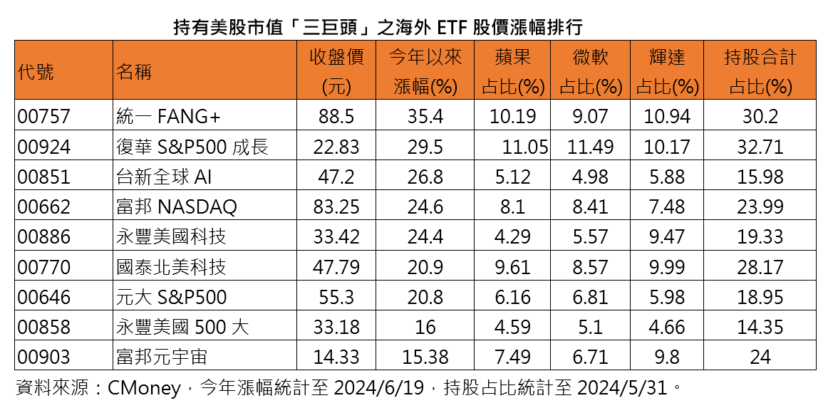 輝達拆股以來,股價持續上攻,市值衝上3.34兆美元,首度躍居全球市值第一大企業,但微軟、蘋果緊追最後,市值也分別達3.32兆、3.29兆美元,這場市值龍頭爭霸戰還沒落幕。連帶地,持有「市值3巨頭」的9檔海外股票型ETF,今年績效也跟著受惠,至少15.3%起跳,最猛的統一FANG+ ETF(00757),漲幅35.4%;其次是復華S&P500成長(00924)的29.5%。另外,美股基金績效,也跟著起飛。
