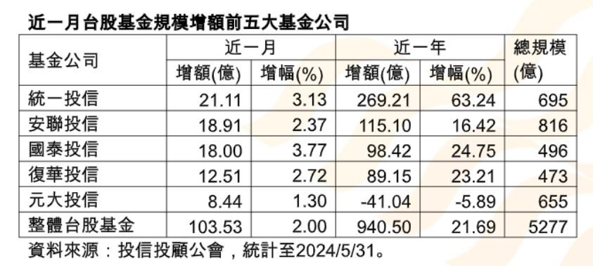 投信投顧公會數據顯示,近一月整體台股基金規模增加103.53億,增幅2%。規模增加最多的基金公司為統一投信,近一月增加21.11億至694.92億,增幅達到3.13%。