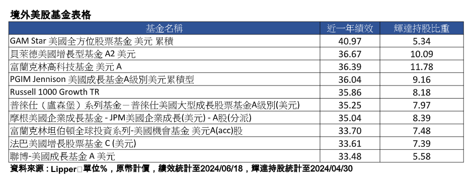 根據統計,近一年績效超前的境外美股基金中,輝達幾乎都位於前10大持股之內,但因為各檔基金的投資風格不同,基金團隊的選股邏輯也不盡相同,因此持股比重有差異,像是PGIM Jennison美國成長基金、富蘭克林高科技基金、貝萊德美國增長型基金持有輝達的比重最高,占基金持股的9.1%至11.8%不等,另外也有同類型基金持有輝達僅約5%上下。