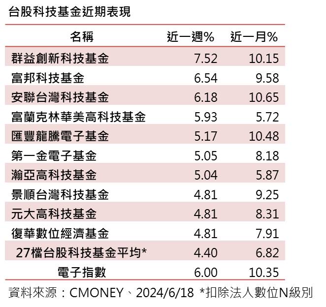 台股科技基金績效也水漲船高,統計27檔台股科技基金,近一周平均績效4.4%,其中,群益創新科技基金7.52%漲幅居冠,其次依序為富邦科技、安聯台灣科技基金,也有6%以上的好表現。法人表示,受到科技產業看俏的帶動,科技基金可望有連動效益,後市不看淡。