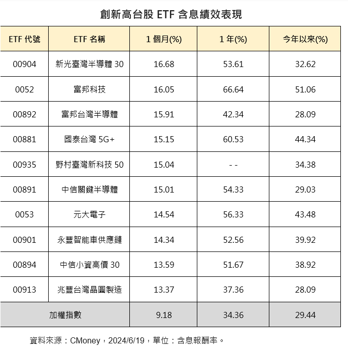 新光臺灣半導體30 ETF(00904),今天股價也創新高,00904經理人詹佳峯表示,台股這波表現驚驚漲,主要來自美科技股強勢演出,由於美降息預期升溫,美科技股大漲,費半指數已一路上衝,屢屢創下歷史新高紀錄,看出AI+半導體大潮來臨,全球半導體產業坐擁AI強勁成長引擎,股價維持多頭趨勢不變,而台灣半導體供應鏈亦最直接且優先受惠,包括具先進製程技術領先的台積電、AI晶片的聯發科等,近期股價分別強勢領攻,台積電股價更不斷突破創新高,距離千金股僅一步之遙。