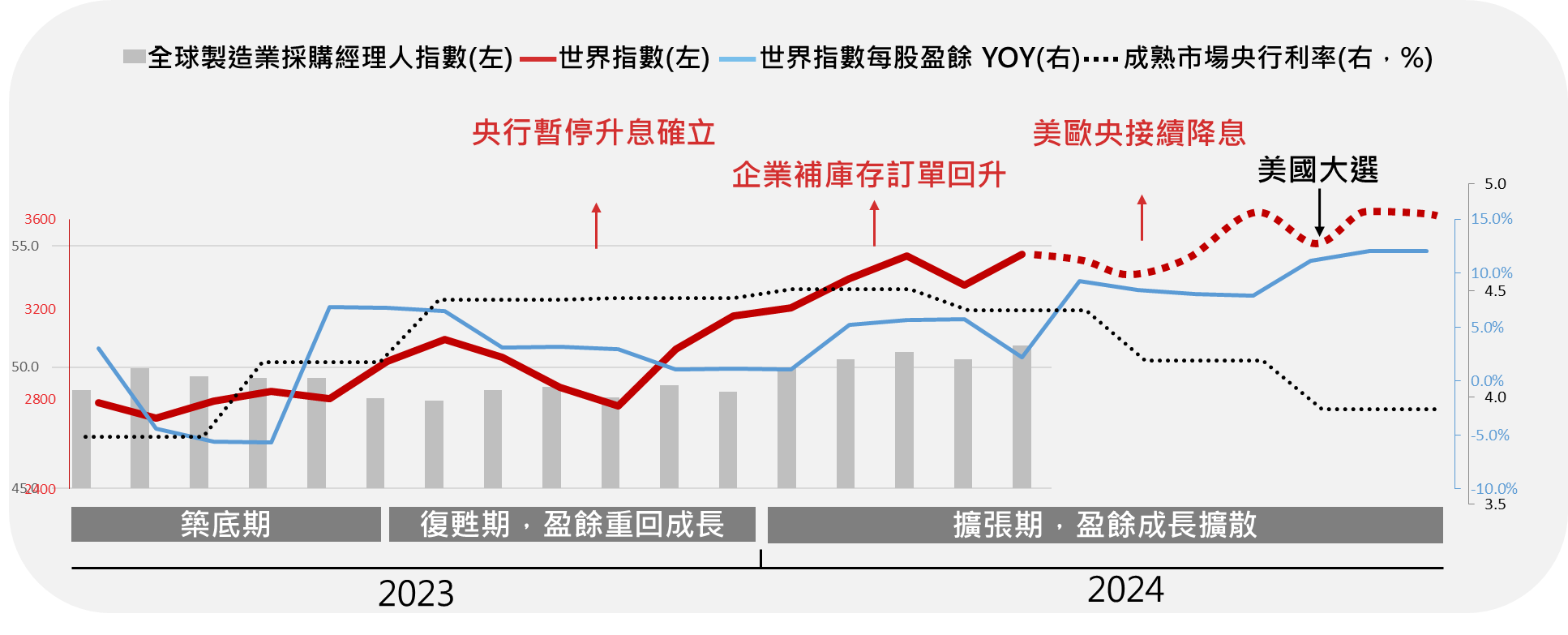 中信銀指出,成熟國家央行陸續啟動降息,金融市場走勢將延續良性發展的路徑,帶動企業獲利持續成長,並促使獲利動能往美國以外的市場及科技以外的類股擴散。然而美國大選、地緣政治風險恐為下半年行情的最大不確定性,且中東地緣動盪尚未消弭,川普與拜登於民調差距有限之下,雙方為爭取選票於中東及俄烏地緣事件立場搖擺,也試圖對中國大陸再打貿易戰,造成政經不確定性上升。