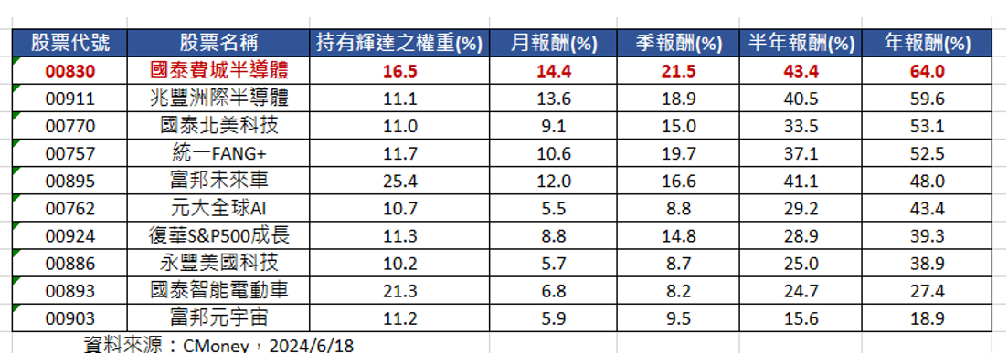 觀察市場上持有輝達比重較高的前10檔ETF,近一年報酬前五名分別是:國泰費城半導體(00830)的64%、兆豐洲際半導體(00911)的59.6%、國泰北美科技(00770)則是53.1%,以及統一FANG+(00757)的52.5%和富邦未來車(00895)的48%。
