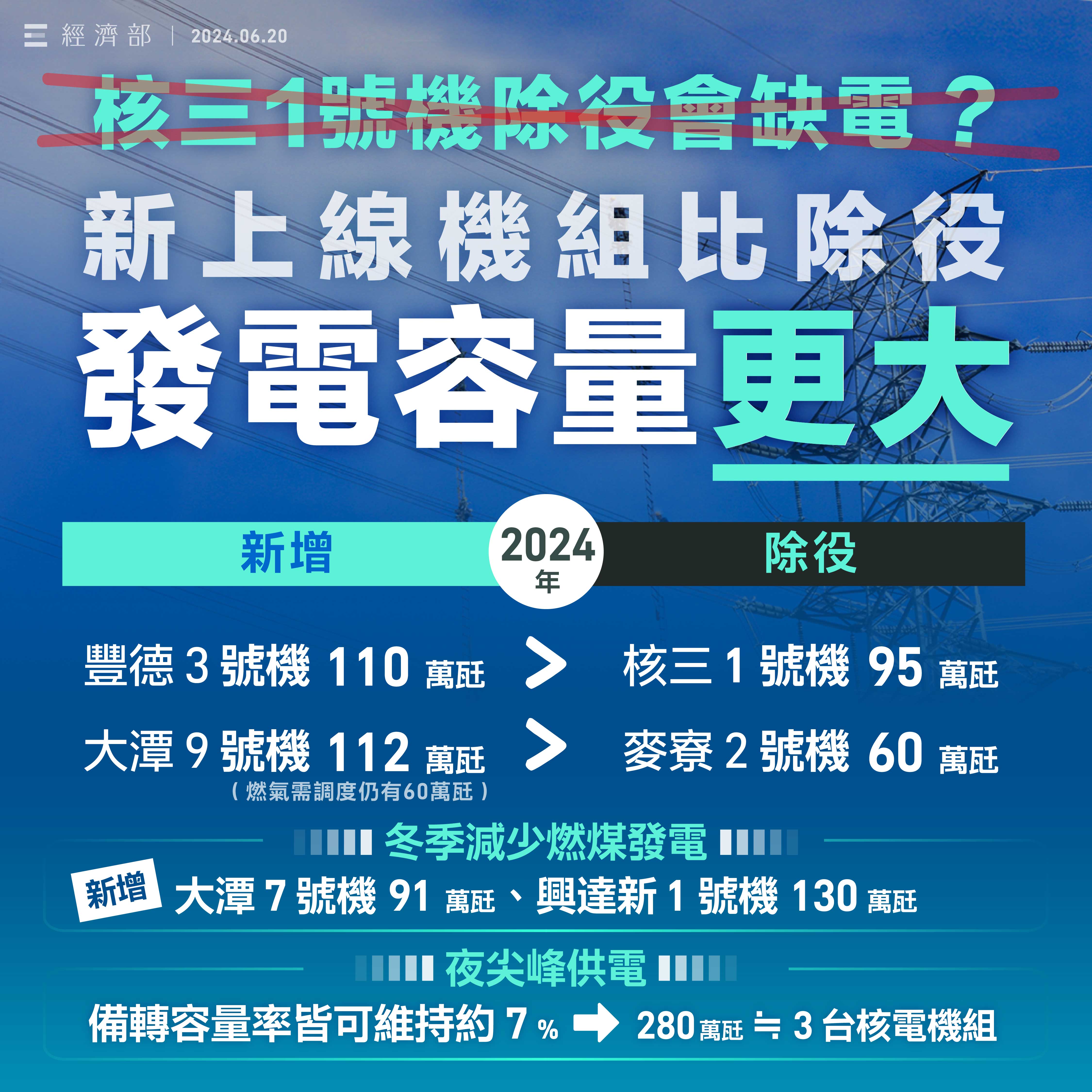 今年7月,核三1號機(95萬瓩)除役,但民營豐德電廠3號機(110萬瓩)加入供電;9月麥寮2號機(60萬瓩)除役,但同時新上線的大潭9號機供電能力112萬瓩,即使考量天然氣調度,仍可貢獻發電60萬瓩,各月份供電能力皆大於尖峰負載需求。
