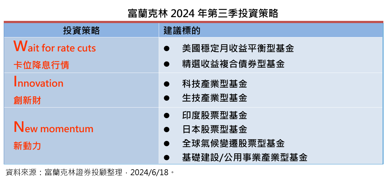 富蘭克林證券投顧第三季投資展望出爐,建議全球股市屢創新高之際,投資人可適度提高風險意識,但也無須過於保守操作,以免太早離場而錯失長線漲勢,建議採取「WIN 贏家策略」,也就是等待聯準會降息行情(Wait for rate cuts)之際,建議以美國平衡型基金及精選收益複合型債券基金為核心;股票部位看好「創新財Innovation」的科技及生技產業型基金,聚焦於AI PC、AI手機及AI新藥等創新領域的成長潛力,以及「新動力New momentum」題材,包括印度和日本股票型基金。