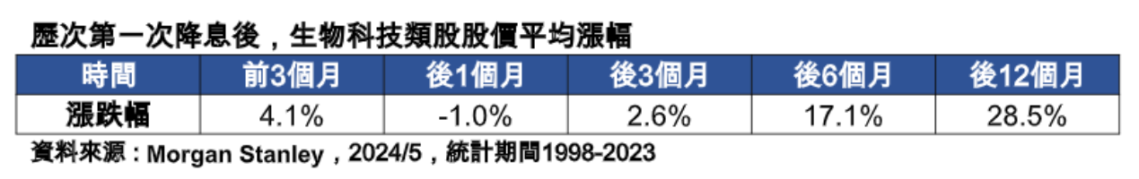 保德信統計1998年以來每逢聯準會首次降息前後的生物科技類股表現,通常前3個月已可看出平均逾4%漲幅,而正式進入降息循環後,不論後3個月、後6個月、後12個月,生物科技類股都能繳出亮眼表現,且漲勢隨時間拉長而增高,若能在降息後持有1年,漲幅甚至可以高達近3成。