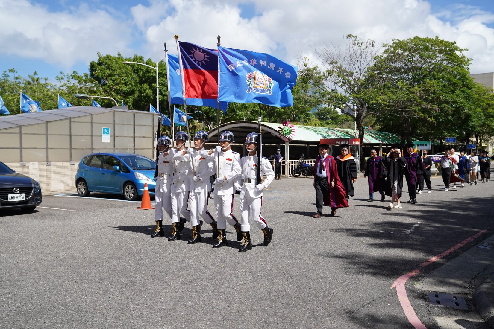 校長王政彥致詞表示,恭喜畢業生學業有成,並以「開路,邁向康莊大道!」期勉畢業生。他表示,畢業是人生階段的一部分結束,更是新階段的開始。開啟或開放一字,英文是「OPEN」,是具有相當正能量的字,人生路無限寬廣,應勇於開啟明路,以這四個英文字母與畢業生共勉。