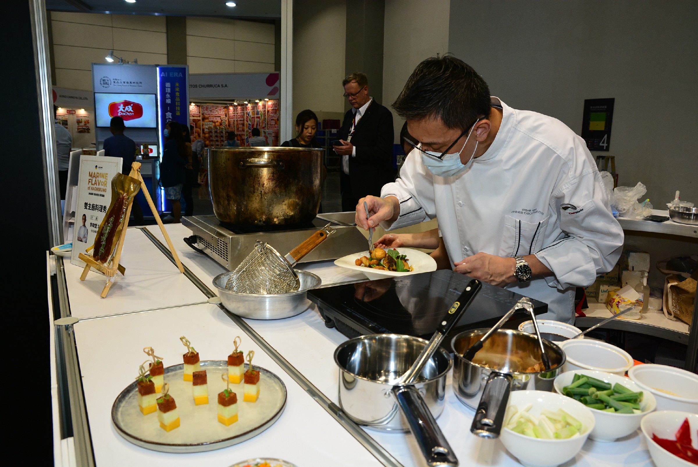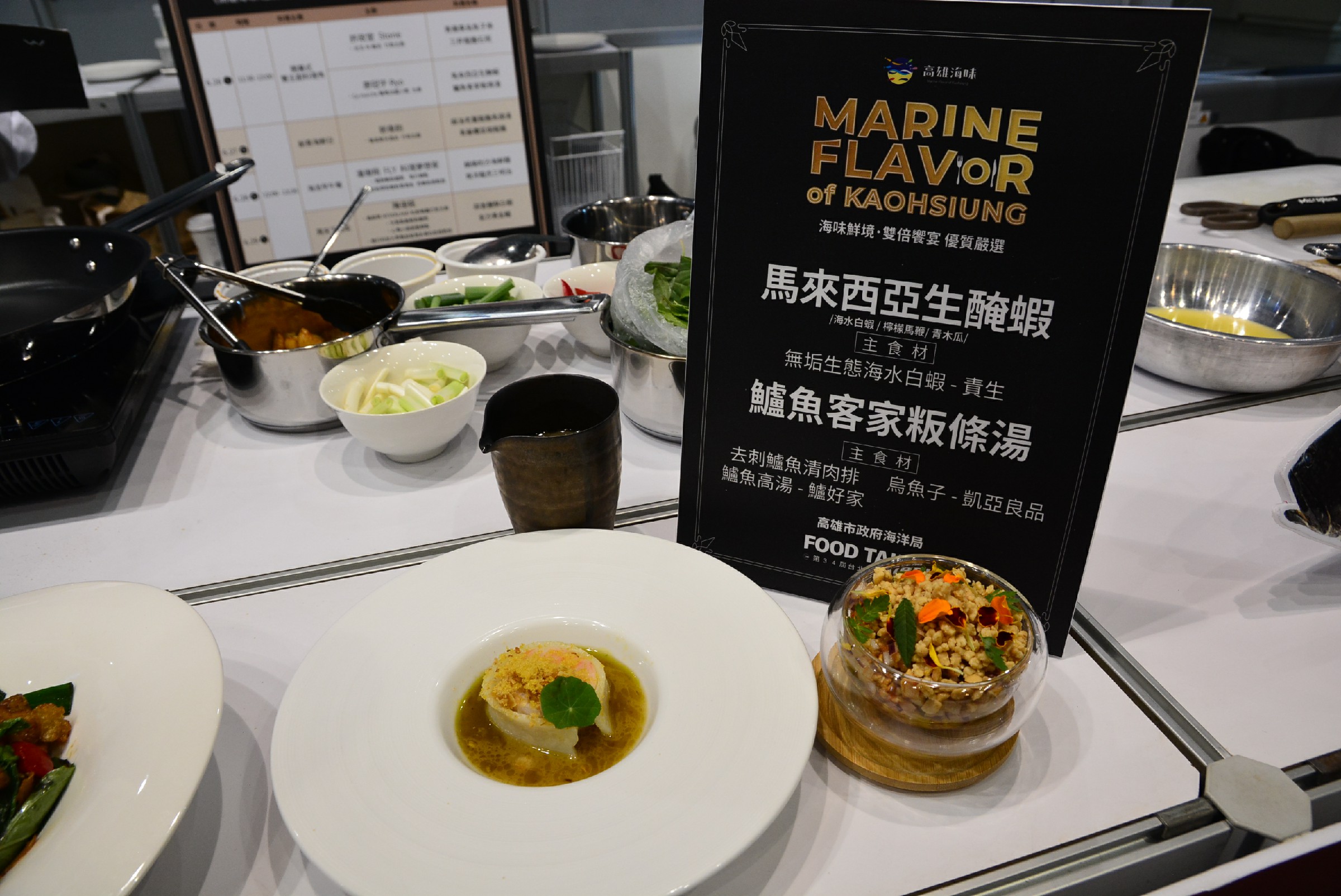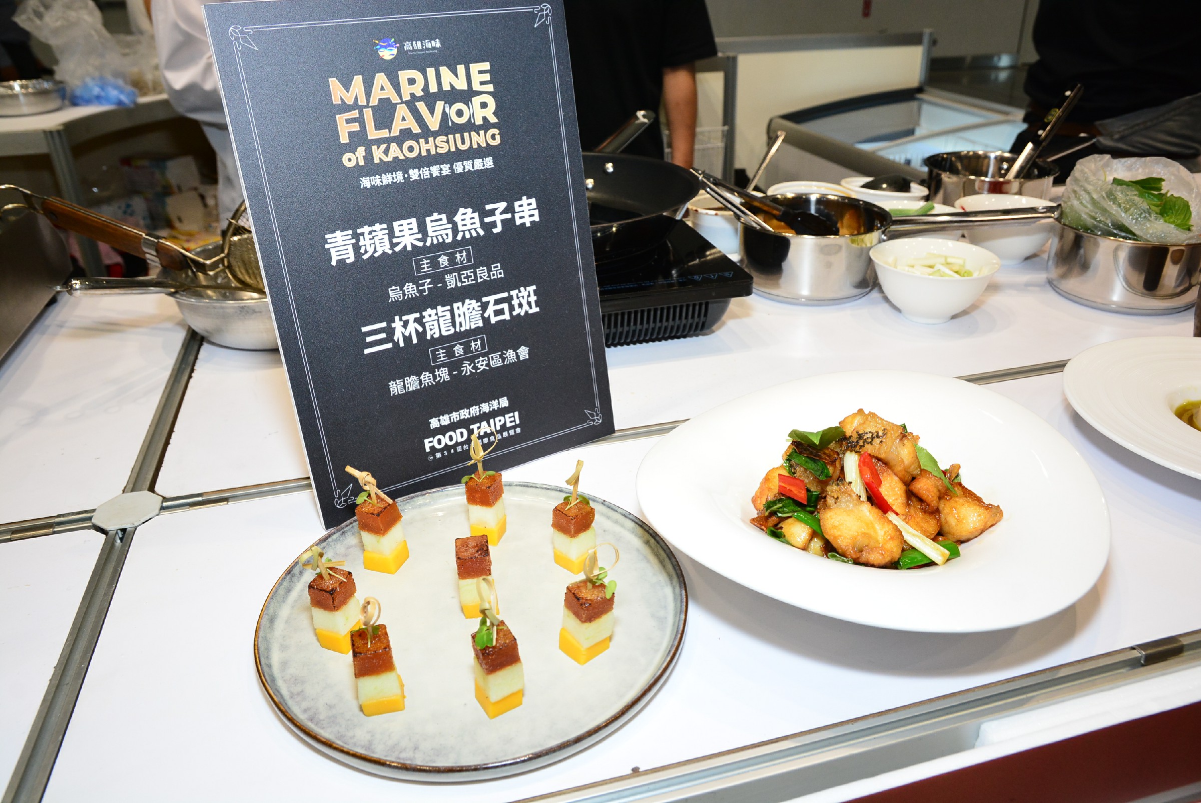 高雄市海洋局特將專區打造成「海味餐酒館風格」,邀請台北W飯店許政堂及薩瑪法國小館廖冠宇兩位極富才華的主廚,以精選高雄海味食材烹煮台北食品展限定「(荔枝酒香)青蘋果烏魚子串」、「鱸魚客家粄條湯」、「三杯龍膽石斑」及「東南亞生醃蝦」等料理,道道媲美五星級餐廳料理,且香味四溢、精緻可口,現場吸引來自國內外的專業買主及通路商聚集品嚐,個個驚呼讚不絕口。