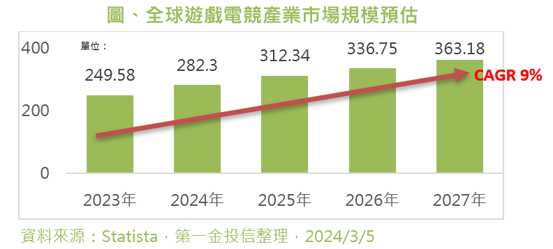 根據Statista的統計,全球遊戲電競市場規模持續成長,預估今年可達2800億美元,未來3年年複合成長率近9%,2027年規模上看約3600億美元。