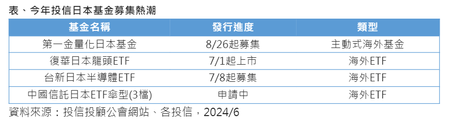 繼高股息ETF熱募浪潮後,新一波募集主題聚集在日本題材,包括多檔日本ETF登場,以及第一金投信8月底要募集量化日本基金,是今年首檔以量化模型同時結合經理人主動操作的日本基金。