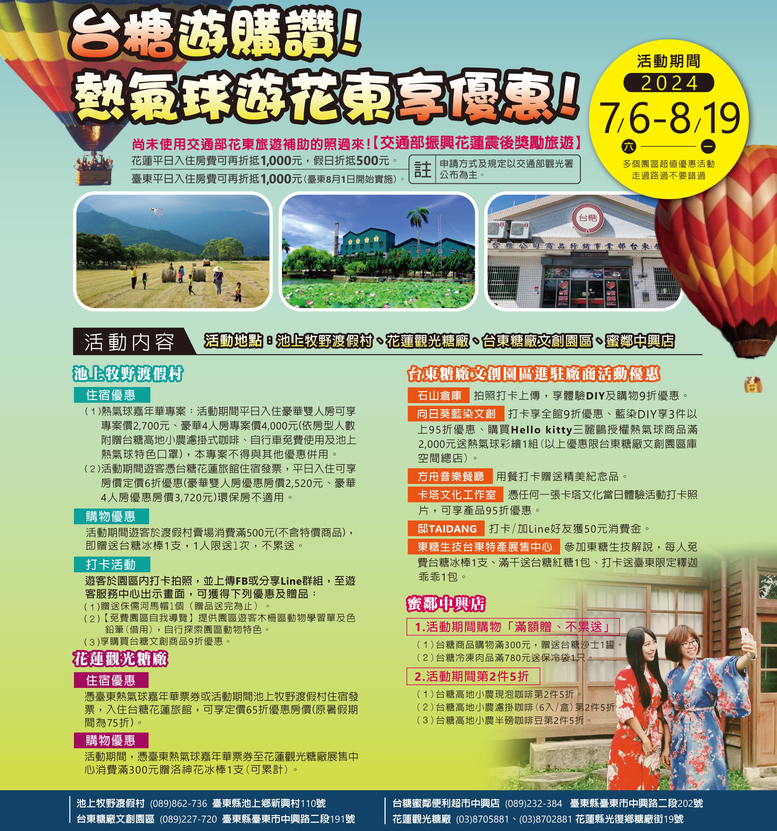 ↑圖說:台糖池上牧野渡假村、台東糖廠文創園區、蜜鄰中興店及台糖花蓮旅館皆於熱氣球活動期間推出限時優惠。(圖片來源:台糖公司提供)