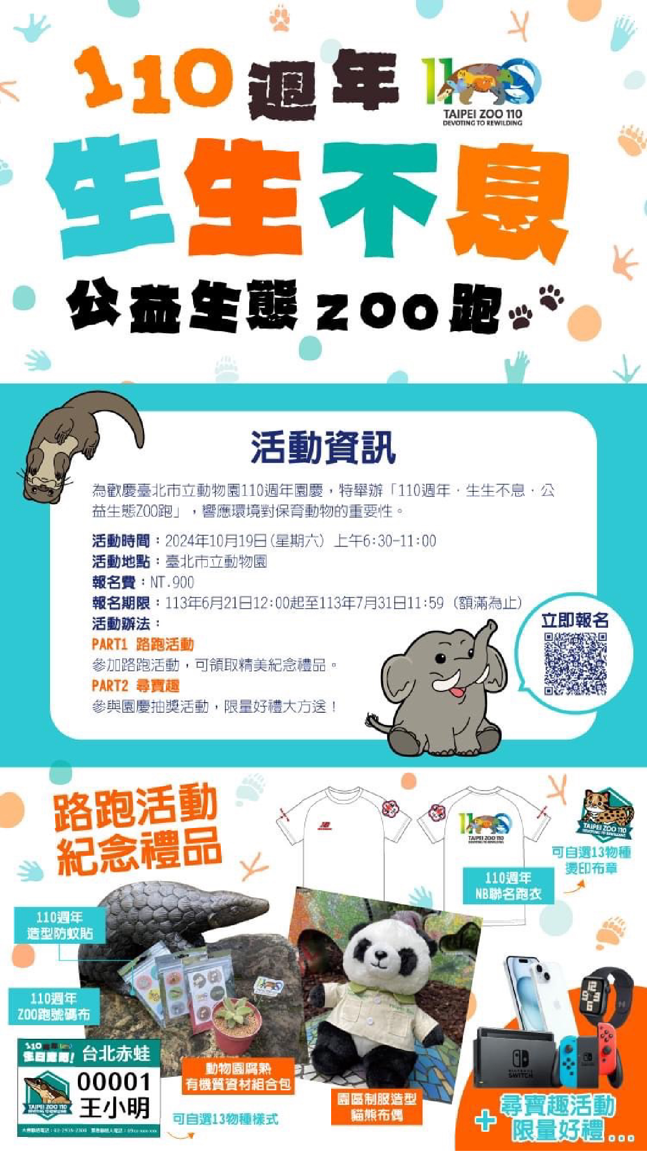 想在動物園裡邊看動物邊路跑嗎?臺北市立動物園為歡慶110周年園慶,與中華民國體育運動總會及臺北市體育總會,將於今年10月19日舉辦「110周年生生不息 公益生態Zoo跑」活動,可沿平常沒開放的園內環園道路跑步,猶如探險野生動物棲息地。同時為提升對野生動物保育認知,特地以致力保育的13物種為焦點設計路跑衣,參賽者可自由選擇,還有園區尋寶趣,歡迎大小朋友參加,報名自即日起至本月31日或額滿為止。