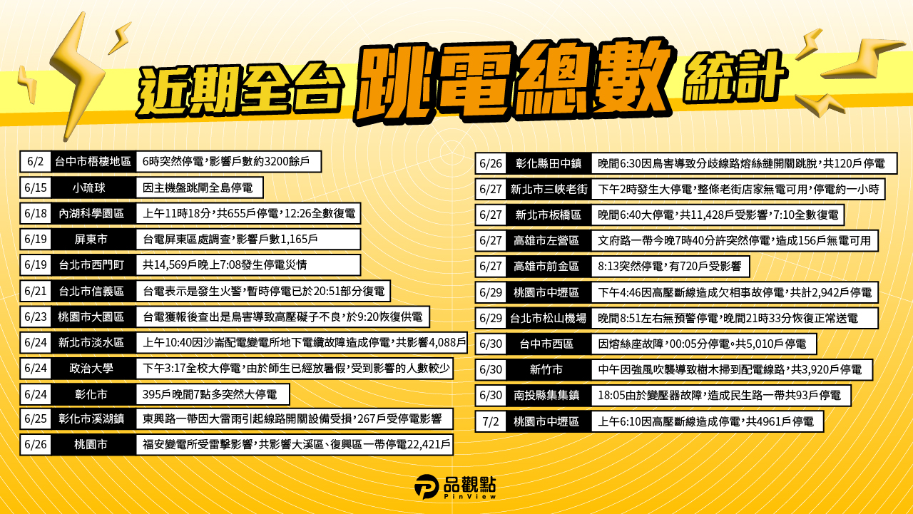 全台停電、跳電事故仍頻傳,政府堅稱不缺電。行政院長卓榮泰2日答詢表示,未來還有新的電廠會增加,但仍要看電廠建設速度,至少能確保2030前不缺電。經濟部長郭智輝答詢稱台灣近期跳電次數並沒有比較多,只是因為媒體的報導,好像每天都有跳電,強調未來不會缺電。