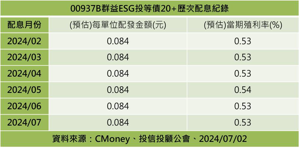 群益ESG投等債20+(00937B)又要配息囉!群益投信已經公告,預估這次每股配發0.084元,是上市以來第六次配息,且連續六次配息金額一致。除息日訂於7月19日,想參與領息的投資人,最晚要於7月18日買進,收益分配發放日訂於8月9日。