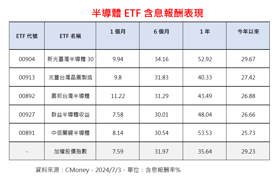 根據CMoney統計半導體ETF從年初迄成,還原淨值的含息報酬表現,以新光臺灣半導體30 ETF(00904)上漲29.67%最強,領先其他半導體ETF,並打敗同期間台股的29.23%。