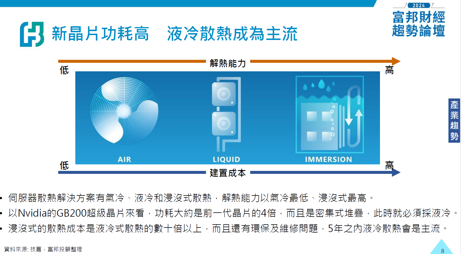 由於新晶片功耗高,散熱成為AI伺服器發展的重點之一。伺服器散熱的解熱能力以氣冷最低、浸沒式最高。但浸沒式散熱成本為液冷式散熱的數十倍以上,且還有環保及維修問題,預估5年內液冷散熱將為主流。