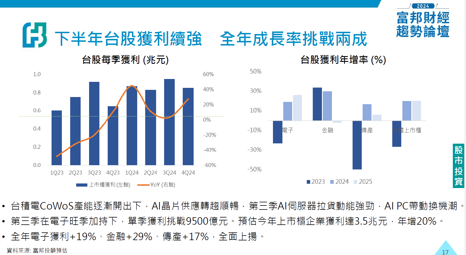 富邦投顧發表台股下半年投資展望,董事長蕭乾祥指出,預估台股高點上看23800點,區間下緣為2萬點,預估第三季見全年高點,有可能落在7月除息旺季,接著第四季因有美國總統大選變數,股市或許會往下修正,畢竟去年台股上漲26%,今年以來已上漲30%,因此還是要謹慎。