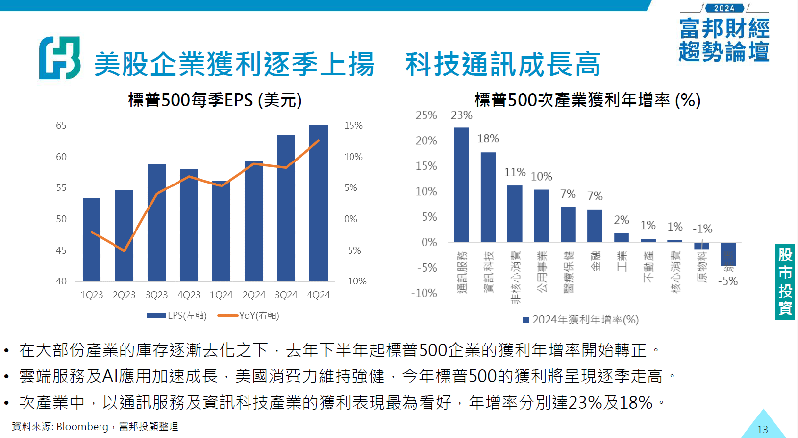 受惠雲端服務及AI應用加速成長,美國消費力維持強健,今年標普500企業獲利逐季走高。在次產業中,以通訊服務及資訊科技產業的獲利表現最為看好,年增率預估分別達23%及18%。