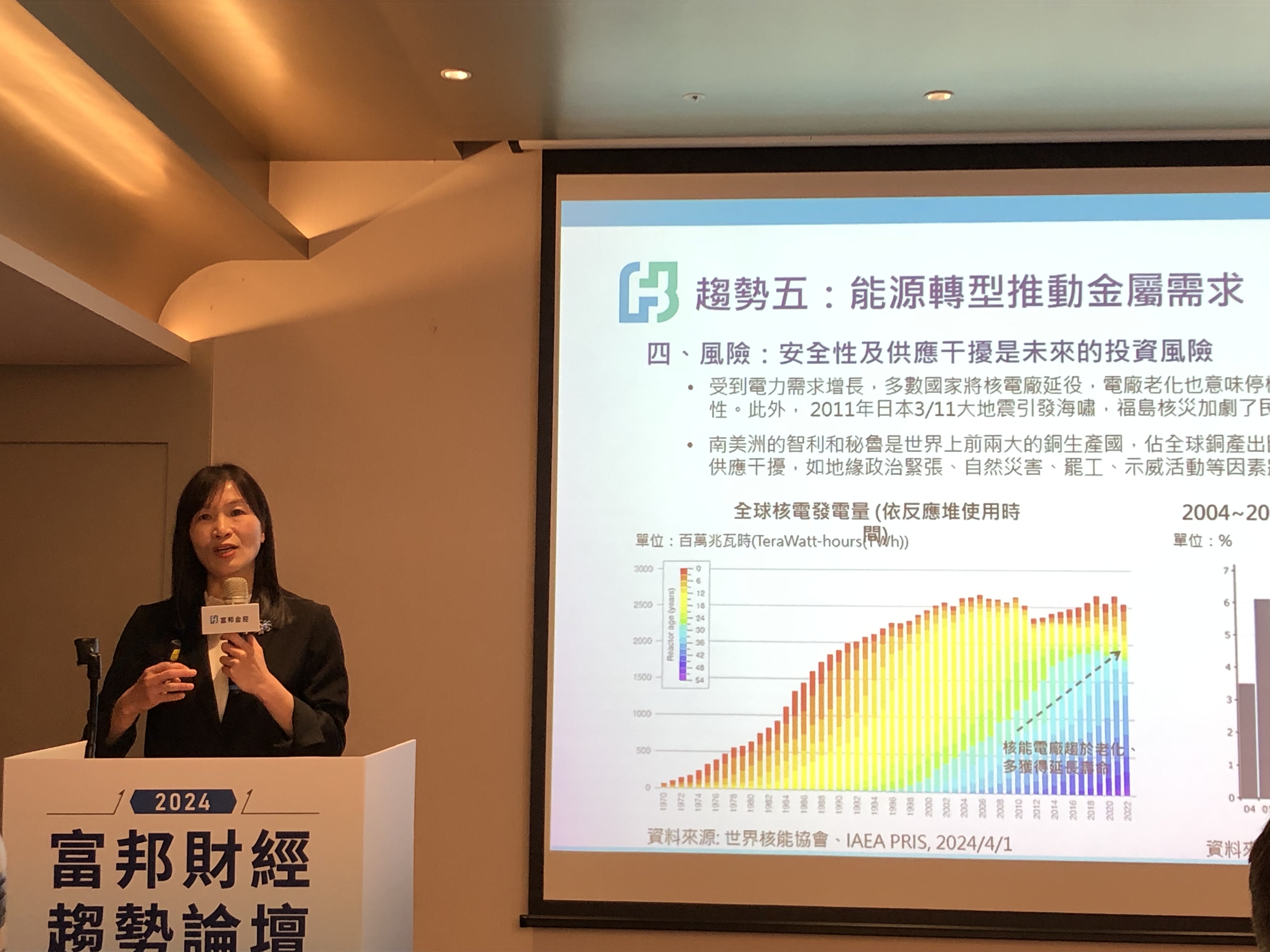 蔡玉惠表示,趨勢五是能源轉型推動金屬需求(如上圖,記者李錦奇攝影),AI及電動車的發展需要大量的電力支應,而地緣政治緊張及烏俄戰爭推動能源危機,全球電力結構加速轉變,多國重視可再生能源發展,提高可再生能源(如水力、風力、太陽能等)及核能的佔比。在各個可再生能源中,銅扮演了重要的角色,可再生能源設備的銅使用是化石燃料電廠的2~7倍。且銅是電動車及各項電力設備的必須金屬,隨著電動車、電網基礎設施和資料中心的需求增長,但新銅礦的建設需要10年~15年,預估到2035年,銅礦將供不應求。