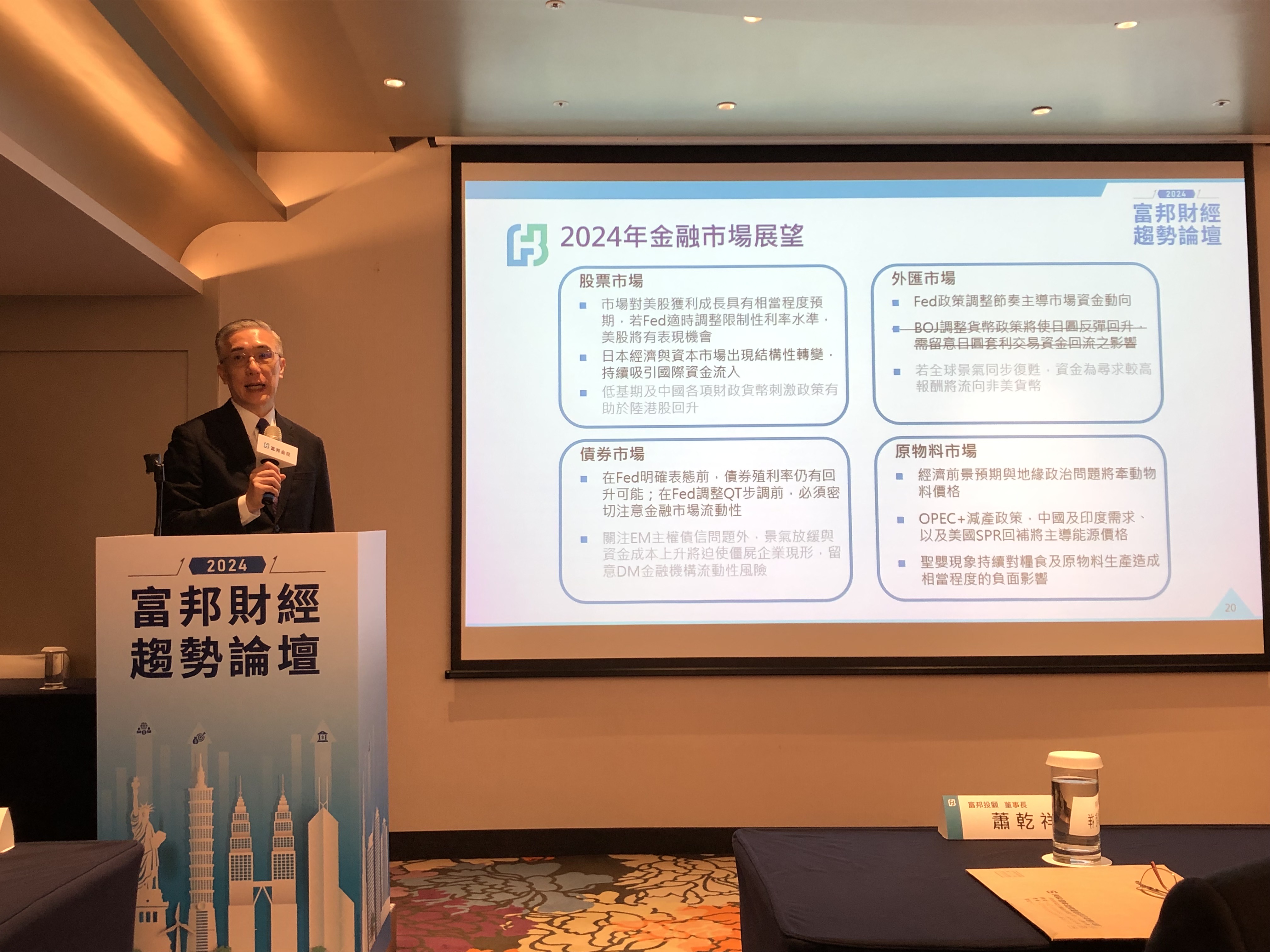 富邦金控今天舉辦「2024富邦財經趨勢論壇」年中場前記者會,提出下半年有三大關注焦點:Fed政策、地緣緊張情勢、美國總統選情,至於投資人應該掌握的五大投資趨勢,則包括美企引領AI、中國新三樣、AI PC元年、電力需求激增、能源轉型。