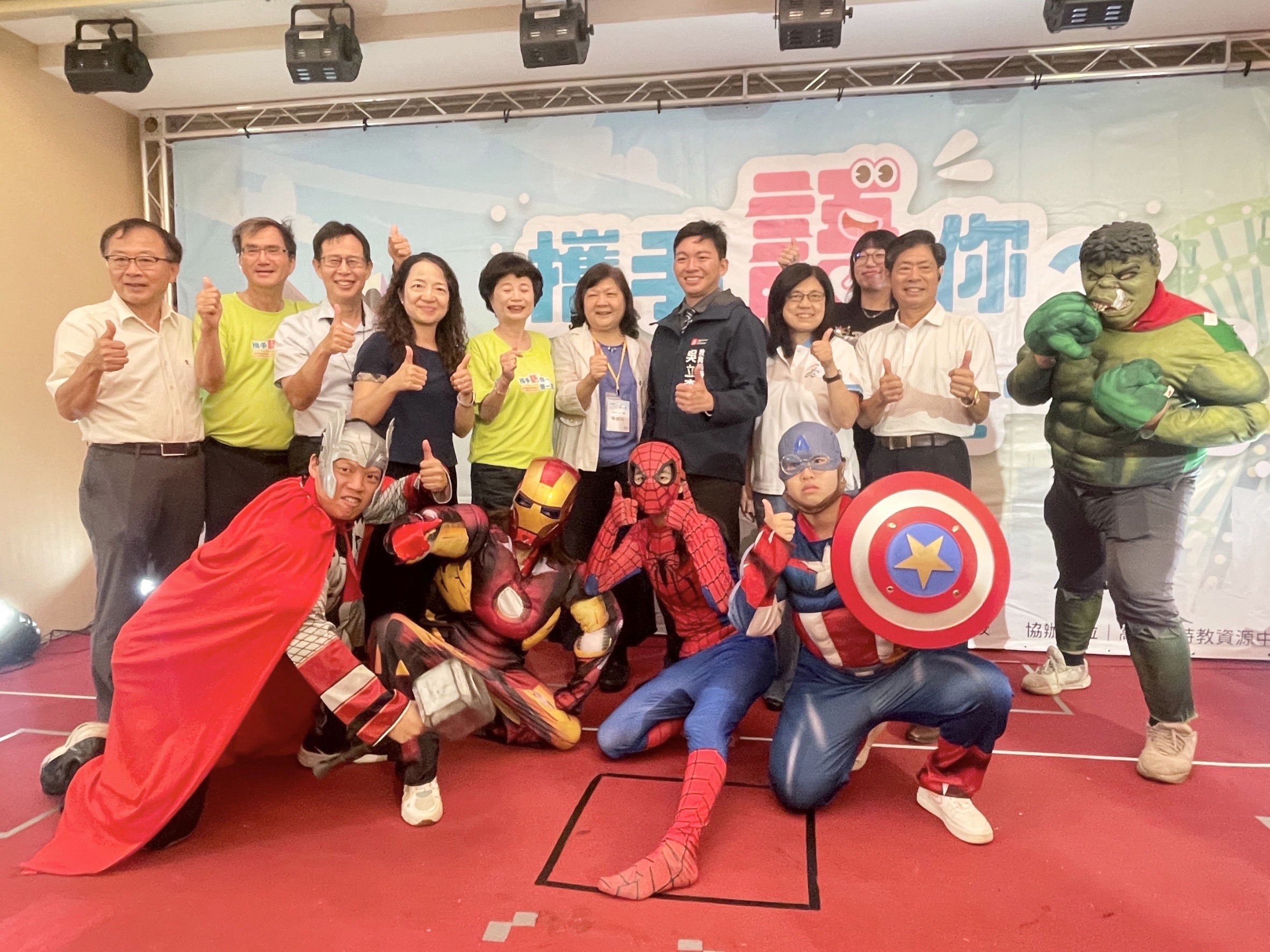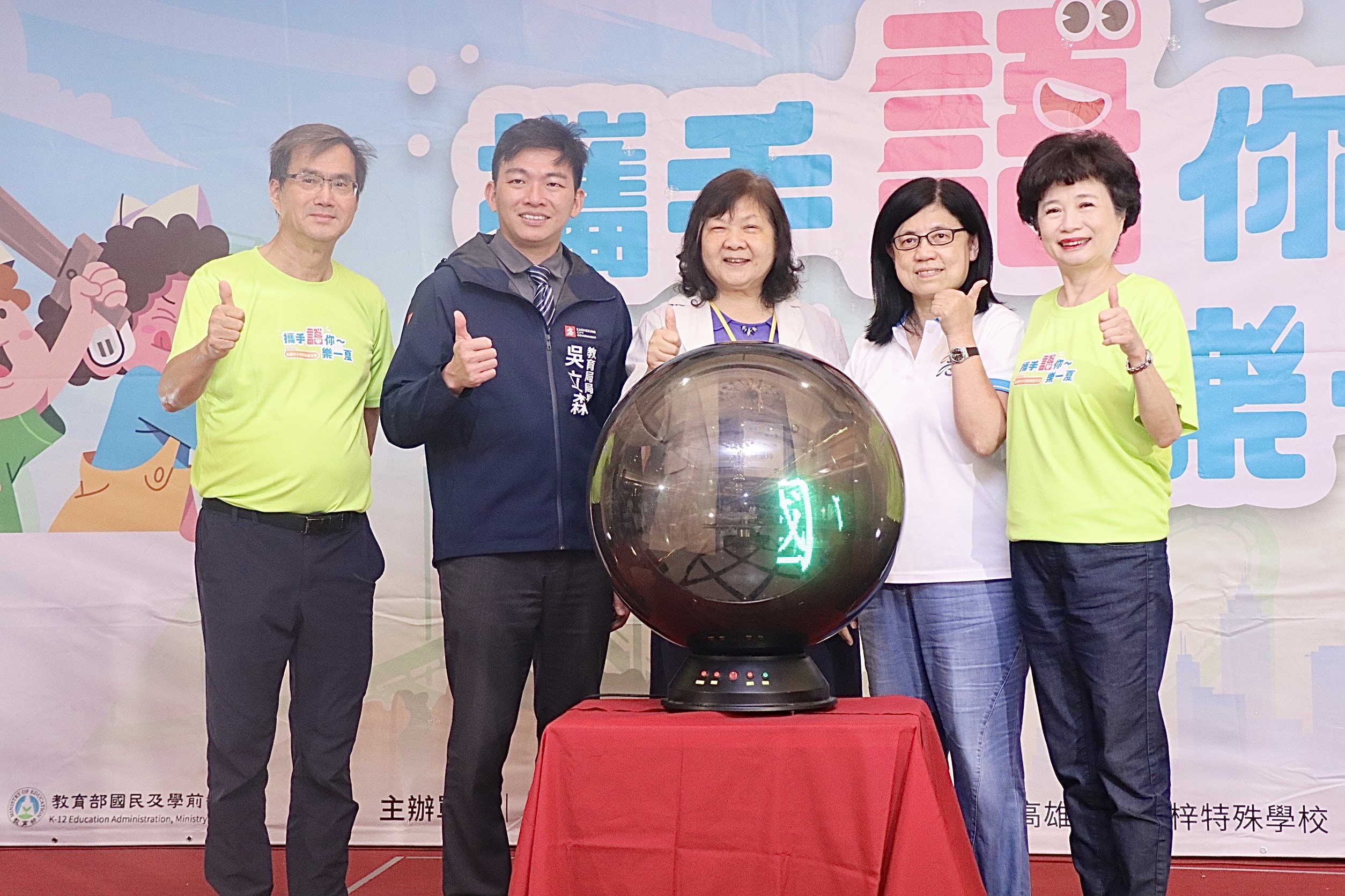 ↑圖說:全國國中小學聽障夏令營7月3號到7月5號在高雄,由教育局長吳立森(左二)與特教學校校長等在義大啟動開幕,有全國176位聽障學生、50位隨隊師長參與。(圖片來源:高雄市教育局提供)