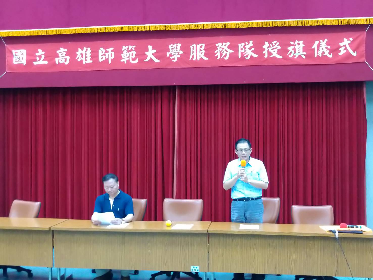 ↑圖說:杜學務長叮嚀同學,出隊注意交通安全及服務倫理王校長授旗給愛鄰社 由副總召杜菲同學代表接受(圖片來源:國立高雄師範大學提供)