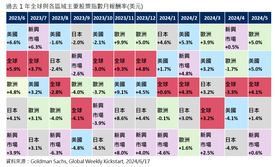 施羅德投信認為下半年股債市仍會持續上漲格局,放眼全球主要市場,美國大選年上漲機率高;歐洲市場短空長多;日本持續結構性成長動能,由下圖可看出過去一年全球主要市場呈現輪動成長態勢,布局可採取看好卻不重壓特定市場的策略,配置一定比例的可轉債,掌握市場輪動以及收益的雙重機會。